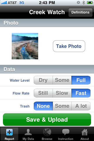 The app uses the iPhone’s GPS chip to pinpoint the creek’s location, and the photos and information are uploaded to the Creek Watch database, which can be tapped by state water officials.
