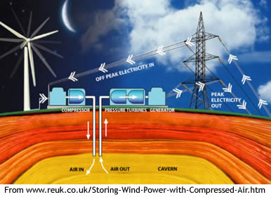 Utility Pacific Gas & Electric, for instance, plans to store energy in the form of compressed air pumped into a cavern. When needed, the air would be released to power an electricity-generating turbine. The utility is also exploring using renewable energy to pump water uphill to a reservoir. When demand spikes, the water would be allowed to flow downhill and run a turbine.